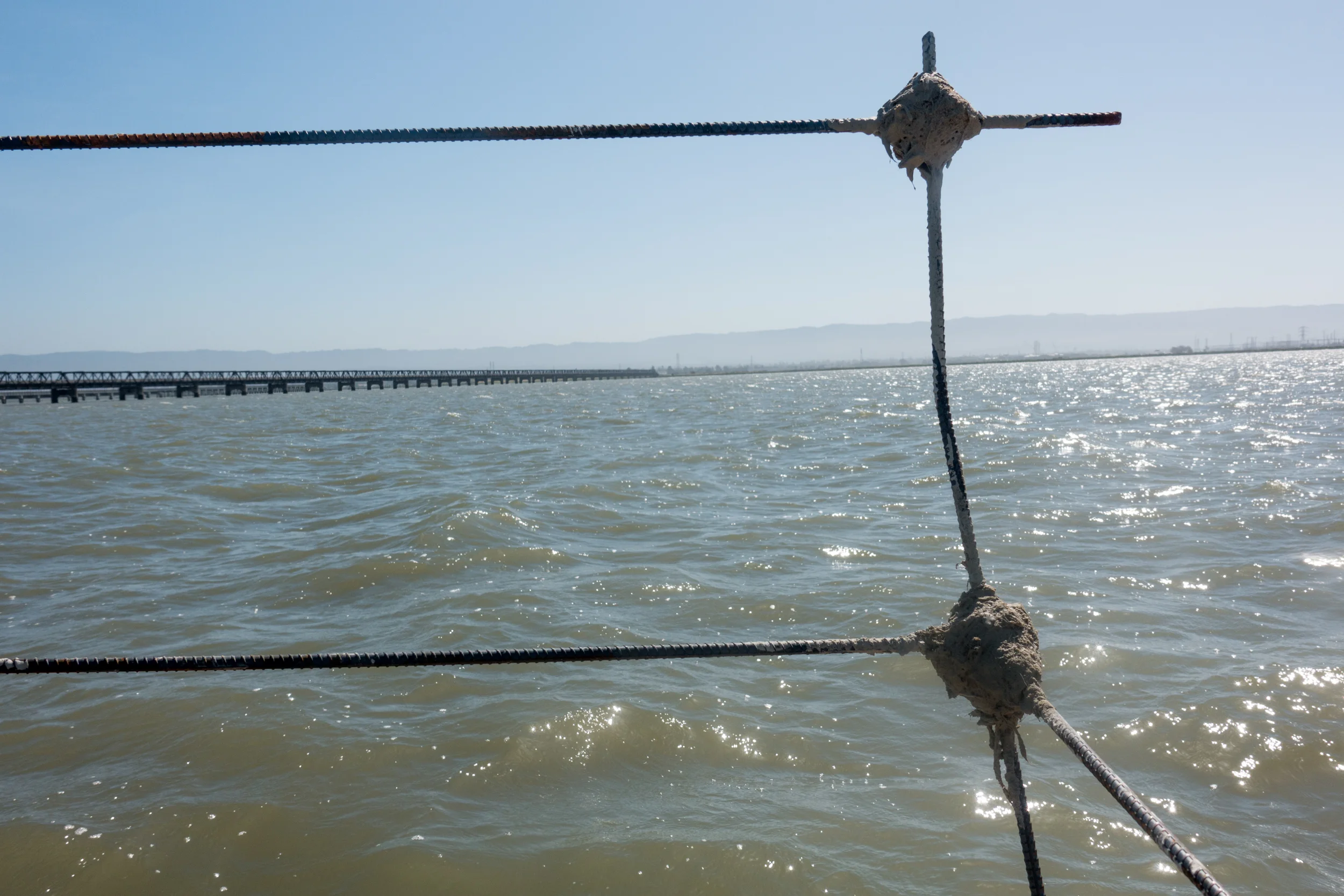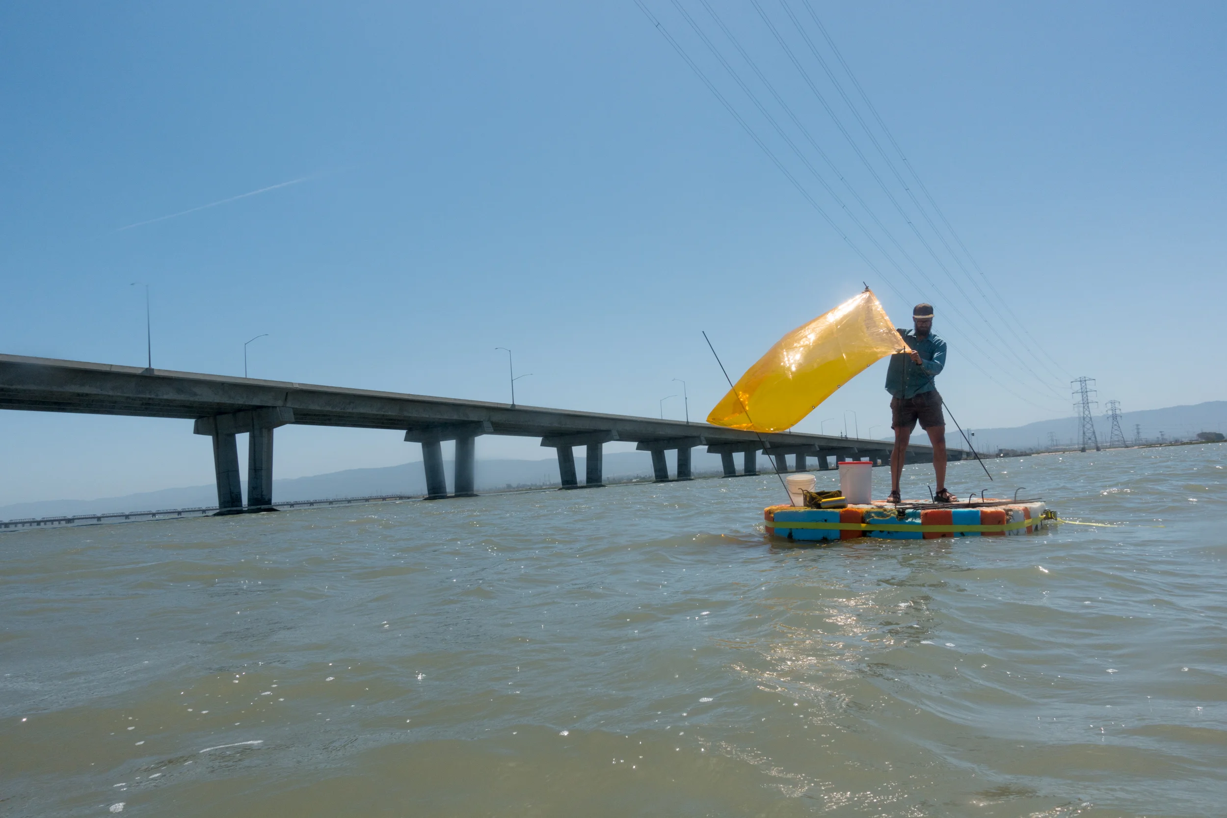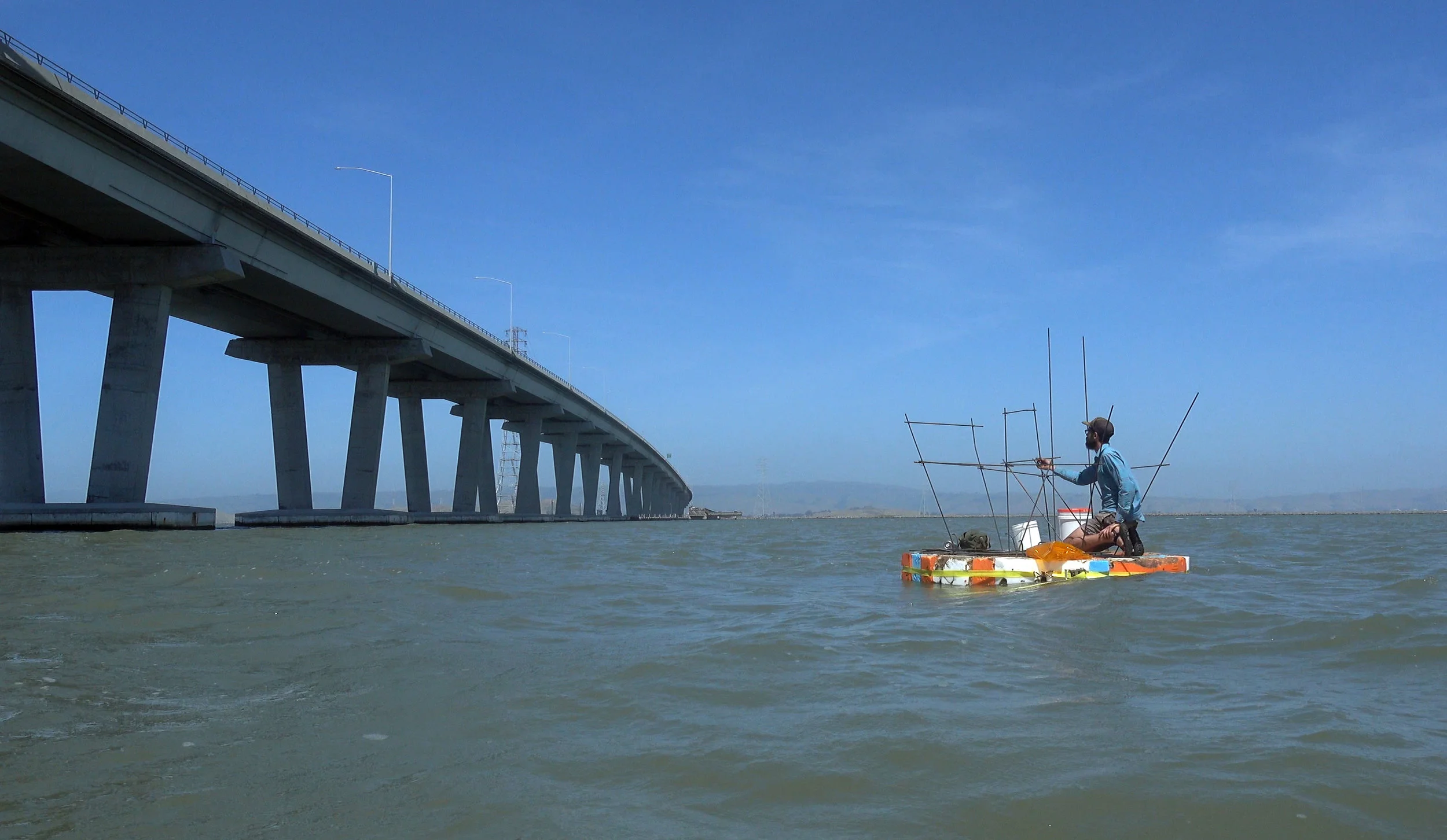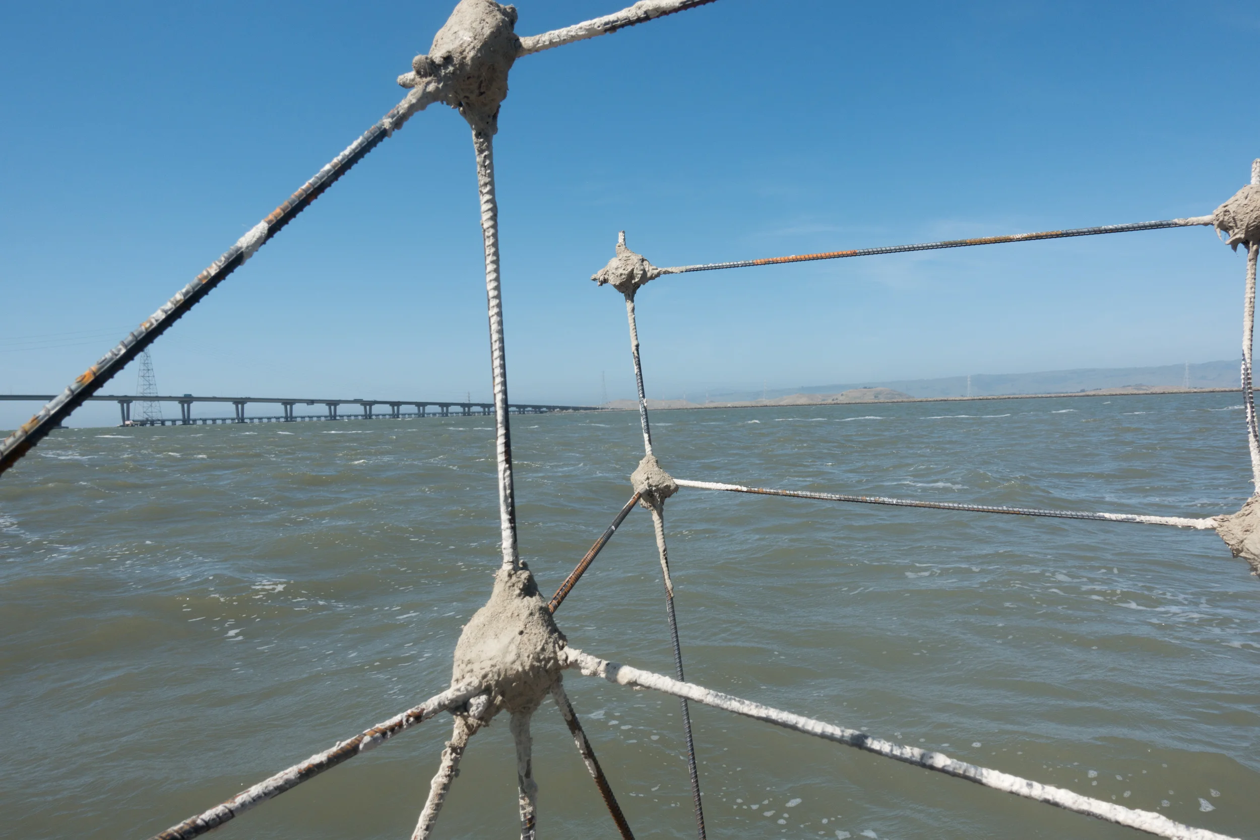 Using the Bay’s detritus to create an interpretation of a Water Lot reclaimed as a floating island studio, I drifted between the Dumbarton Bridge and the abandoned Dumbarton Rail Bridge while “developing” my plot through improvised construction of a site-responsive sculpture of cement and rebar. With knowledge of the winds and tides that day, I allowed the environmental forces to dictate my course and experience of the material landscape. Following the performance, the raft was displayed at the Stanford Art Gallery with the 30 minute video filmed from on and around the raft playing on loop inside of the raft.