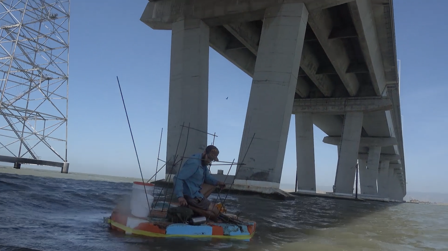Found foam dock floats, tie-down straps, rebar, video loop on iPad